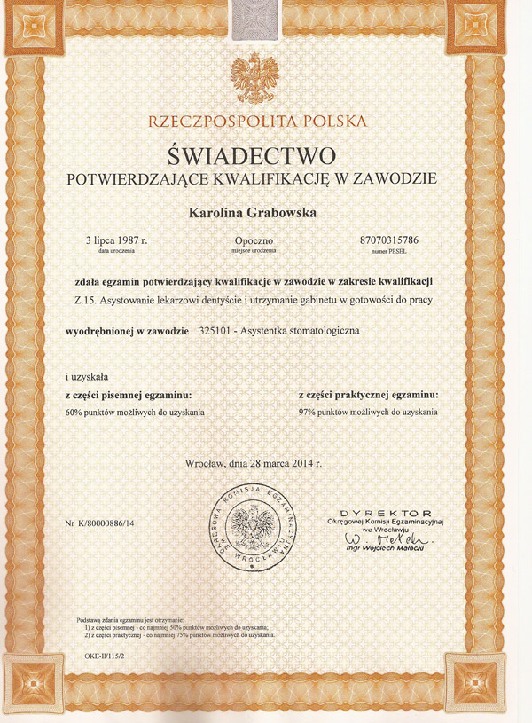 A graduate of the Department of Dentistry in Zabrze at the Silesian University of Medicine in Katowice. In 2000 he was granted a title of specialist in periodontology and oral mucous membrane diseases and in 2005 he has a PhD from the Board of the Faculty of the Silesian University of Medicine, the Department of Dentistry in Zabrze.