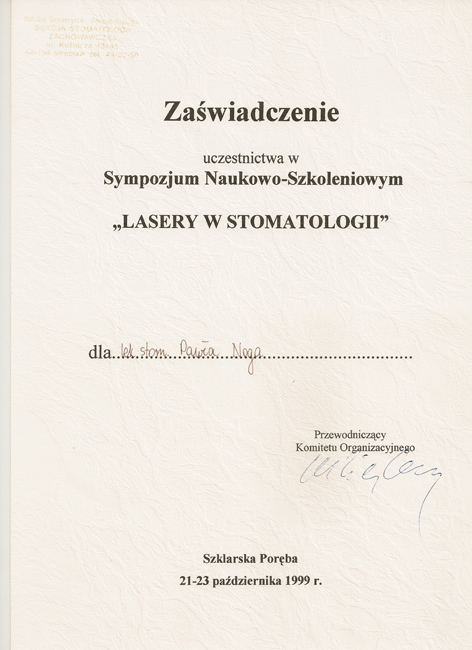 Uczestnik licznych kursów szkoleniowych i konferencji naukowych krajowych i zagranicznych. W pracy klinicznej głównie swój czas poświęca pacjentom z chorobami przyzębia.